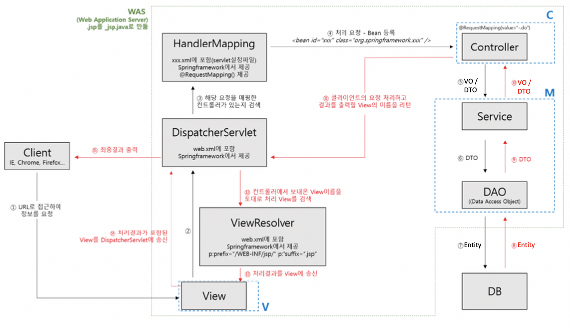 - ์คํ๋ง ๋ชจ๋ธ์ View - Controller - Service - DAO - DB ๋ก ์ด๋ฃจ์ด์ ธ์๋ค.
